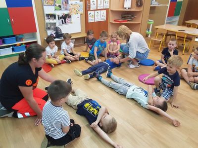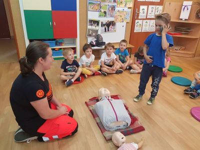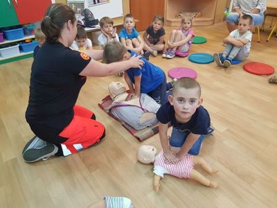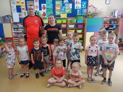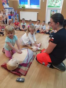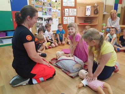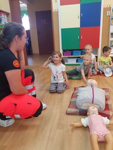 W drugim dniu dzieci miały spotkanie z ratownikami medycznymi. Pani Kamila i Pan Adam opowiedzieli w jaki sposób udziela się pierwszej pomocy, jak pomóc poszkodowanym zanim przyjedzie pogotowie. Dzieci z zainteresowaniem słuchały wskazówek ratowników dotyczących zachowania się w sytuacji zagrożenia życia np. utraty przytomności, krwotoku. Nauczyły się podstawowych numerów telefonu oraz jak wezwać pomoc przez telefon. Duże wrażenie na dzieciach zrobił ,,fantom”, na którym uczyły się podstaw reanimacji. Oczywiście szkolenie nie zrobiło z przedszkolaków profesjonalnych ratowników, ale uczyło radzenia sobie w sytuacjach zagrożenia zdrowia lub życia, oswoiło z tematyką udzielania pierwszej pomocy dlatego każdy z uczestników otrzymał DYPLOM MAŁEGO RATOWNIKA