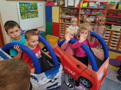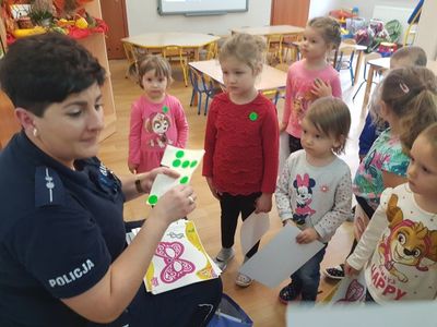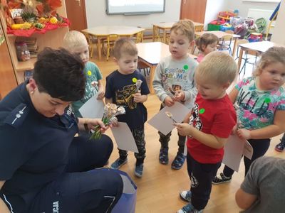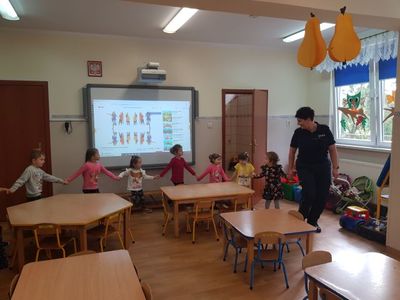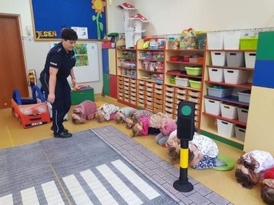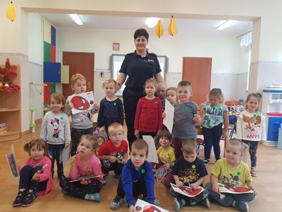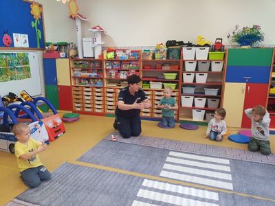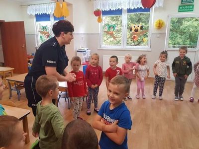 Pani Paulina Potarzycka – policjantka z Powiatowej Komendy Policji w Krotoszynie przeprowadziła w przedszkolu zajęcia edukacyjne z zakresu bezpieczeństwa na drodze. Dzieci poznały zasady prawidłowego zachowania się na ulicy, jaką postawę przyjąć w przypadku ataku nieznajomego psa. Dzieci utrwaliły też numery telefonów alarmowych oraz jak należy wezwać pomoc gdyby zaistniała taka konieczność. Niewątpliwie największą atrakcją była jazda autami, tańce z panią policjantką oraz wiele upominków dla wszystkich przedszkolaków