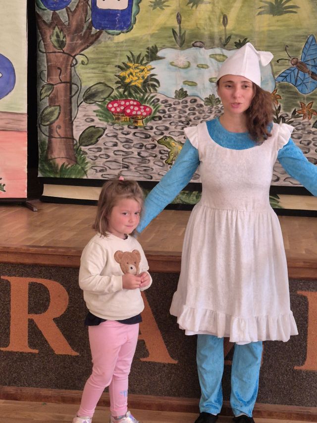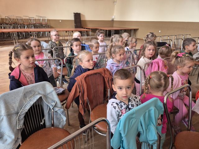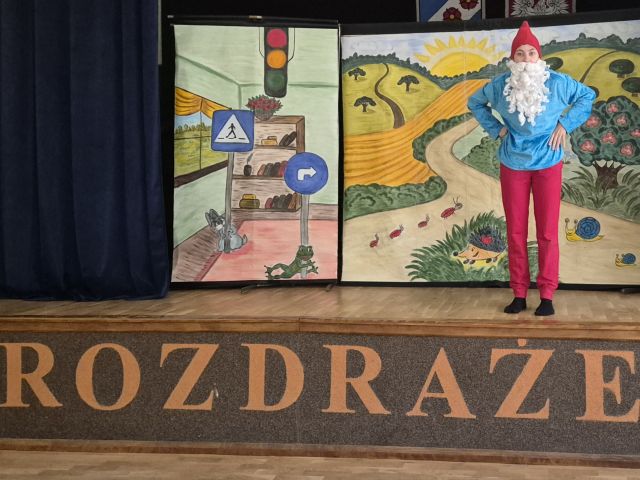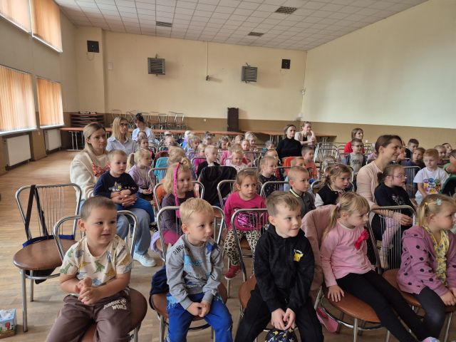 Przedszkolaki wybrały się na Salę Wiejską i obejrzały przedstawienie pt.,, Smerfuj Bezpiecznie". Podczas przedstawienia dzieci uczyły się zasad bezpieczeństwa w ruchu drogowym, w tym znajomości znaków i sygnalizacji świetlnej. Spektakl ten opierał się na motywach ze świata Smerfów i miał na celu przekazanie ważnych informacji w ciekawy i interaktywny sposób.