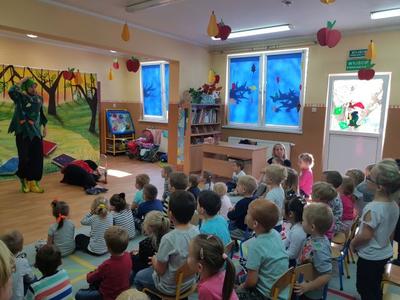 Aktorzy z Teatru Edukacji i Profilaktyki ,,Maska" odwiedzili nasze przedszkole. Celem spektaklu było zapoznanie dzieci z zasadami bezpiecznego zachowania się w domu, na drodze i w wolnym czasie. Uczył jak należy się zachować w niecodziennych sytuacjach. Podkreślał znaczenie asertywności wobec nieznajomych osób oraz ostrożności.