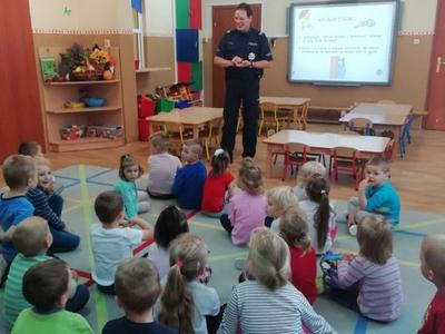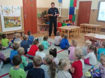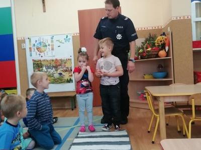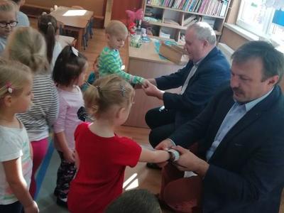 W poniedziałek 23 września dzieci z grupy Motylków i Biedronek podejmowały niezwykłych gości. Do przedszkola przybył wójt gminy p. Mariusz Dymarski, kierownik GZSiP p. Henryk Jankowski oraz z Komendy Powiatowej Policji w Krotoszynie policjant p. Bartosz Karwik. Podczas zajęć warsztatowych dzieci poszerzyły wiedzę i umiejętności praktyczne z zakresu poruszania się po ulicy, kontaktów z obcymi osobami. Pan policjant omówił jak należy się zachować w domu pod nieobecność rodziców, jak należy zachować się w kontakcie z nieznajomym psem. Podczas oglądania filmiku edukacyjnego dzieci utrwaliły numery alarmowe. Na zakończenie wizyty dzieci otrzymały od gości z gminy opaski odblaskowe, by lepiej być widocznym na drodze.