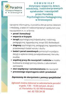 Środowiskowe Centrum Zdrowia Psychicznego dla Dzieci i Młodzieży w Krotoszynie oferuje pomoc i wsparcie: - psycholog/psychoterapeuta - I wizyta, po której jest decyzja z jakiej formy wsparcia dziecko może skorzystać: ( psycholog/psychoterapeuta, psychiatra dziecięcy, pedagog, logopeda/neurologopeda,...