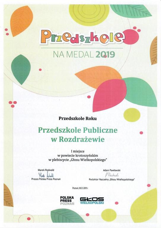 Wszystkim sympatykom naszego przedszkola składamy jeszcze raz gorące podziękowania. To dzięki Wam, otrzymaliśmy I miejsce w powiecie krotoszyńskim w plebiscycie ,,Głosu Wielkopolskiego” Dziękujemy!!!